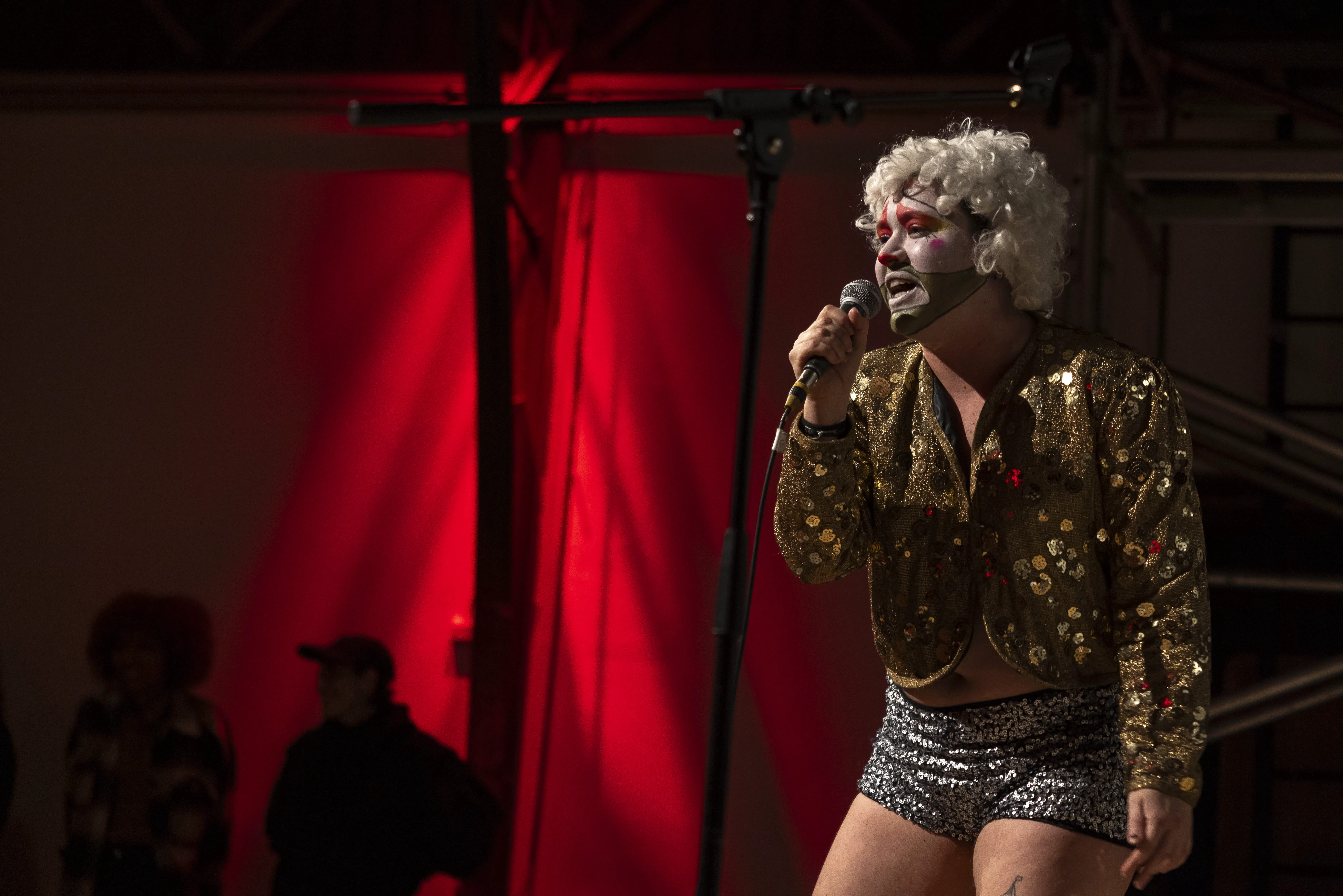 The performance unfolds as a dynamic interplay between structured spectacle and raw emotional exchange. Lip-syncing, an act both deeply performative and intensely personal, becomes a conduit for channeling grief, joy, and longing. These moments are juxtaposed with somatic practices that invite the audience into the clown’s world, breaking the fourth wall in cathartic communion. Together, audience and performer scream their sadness away, releasing a collective weight that words alone cannot carry.