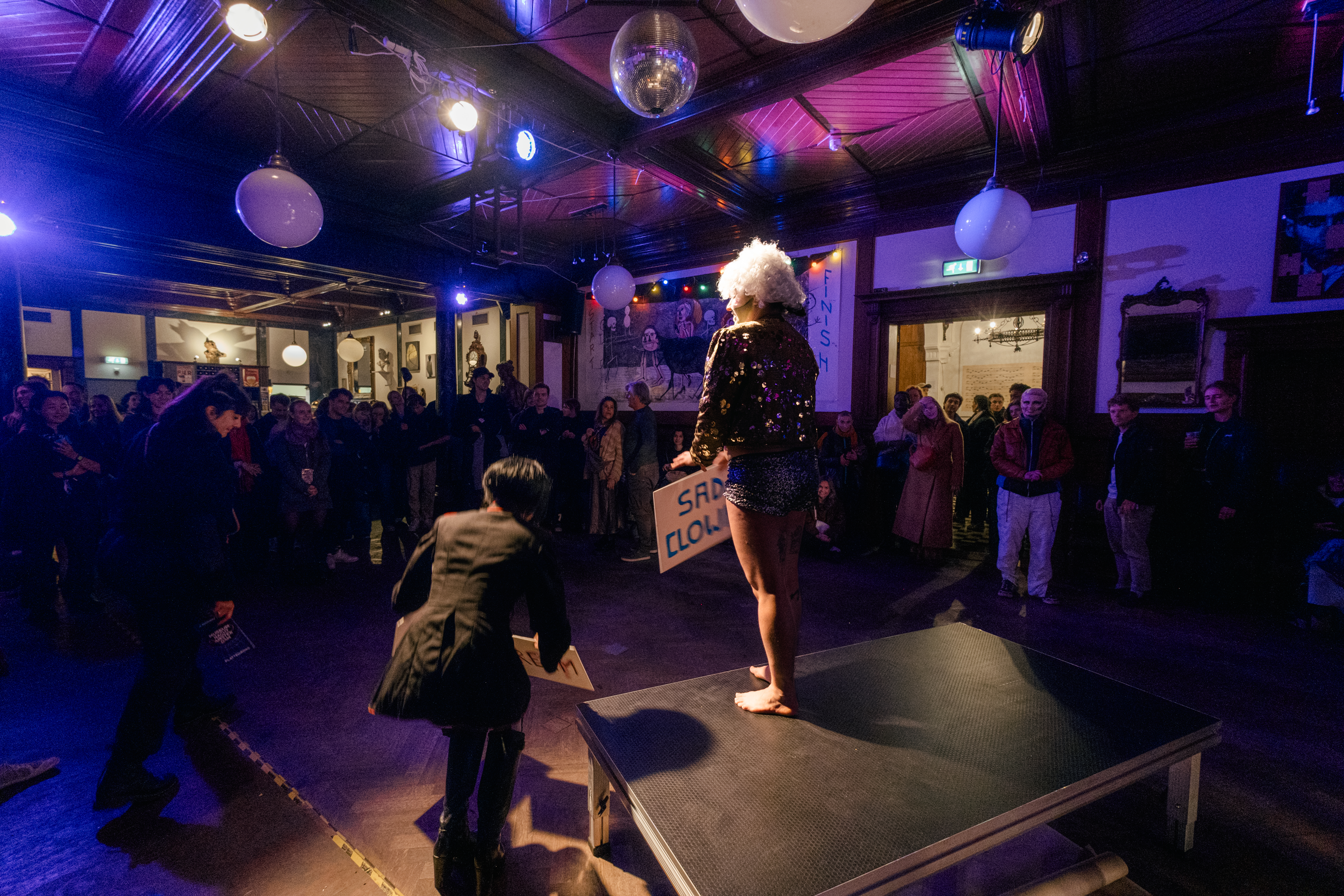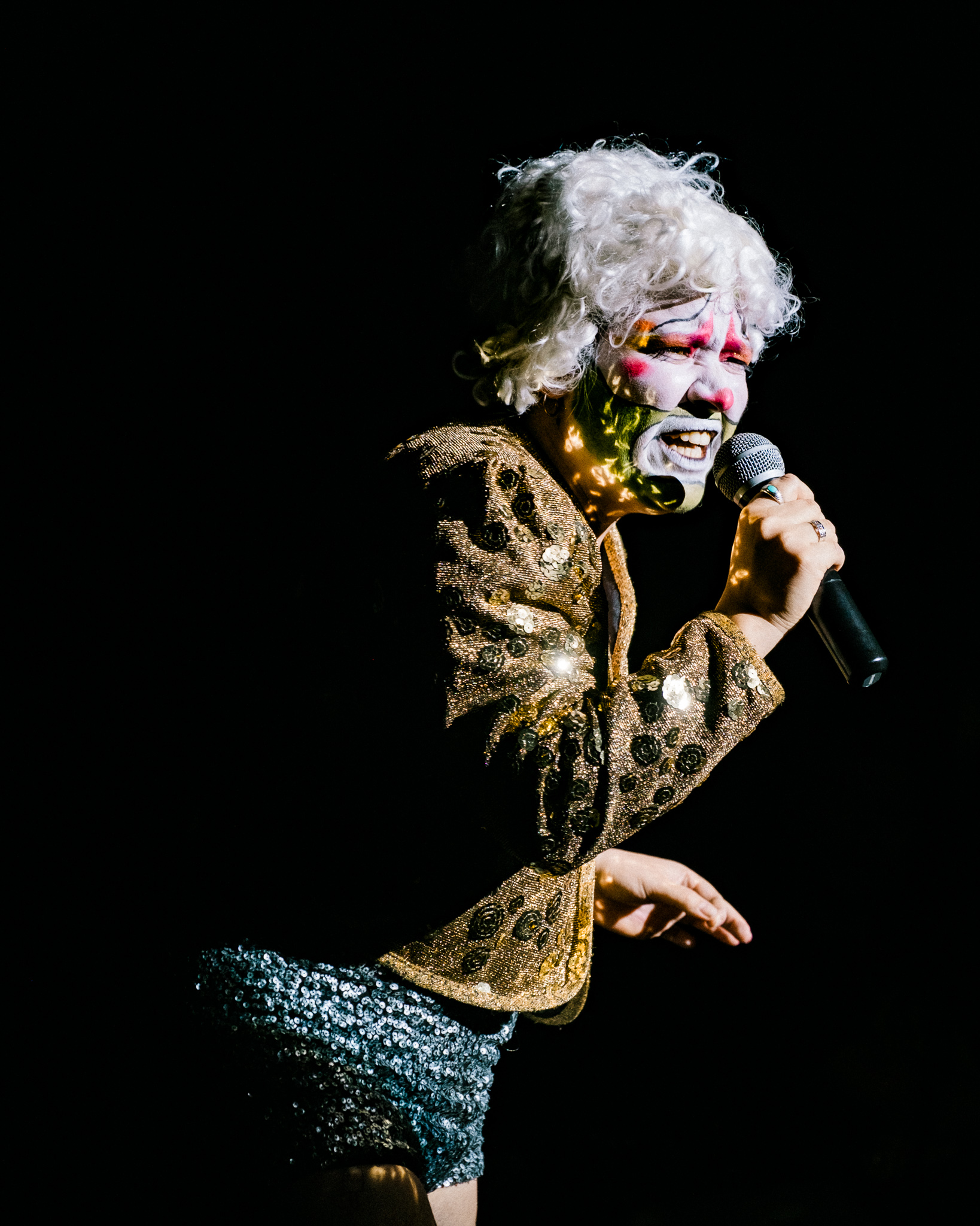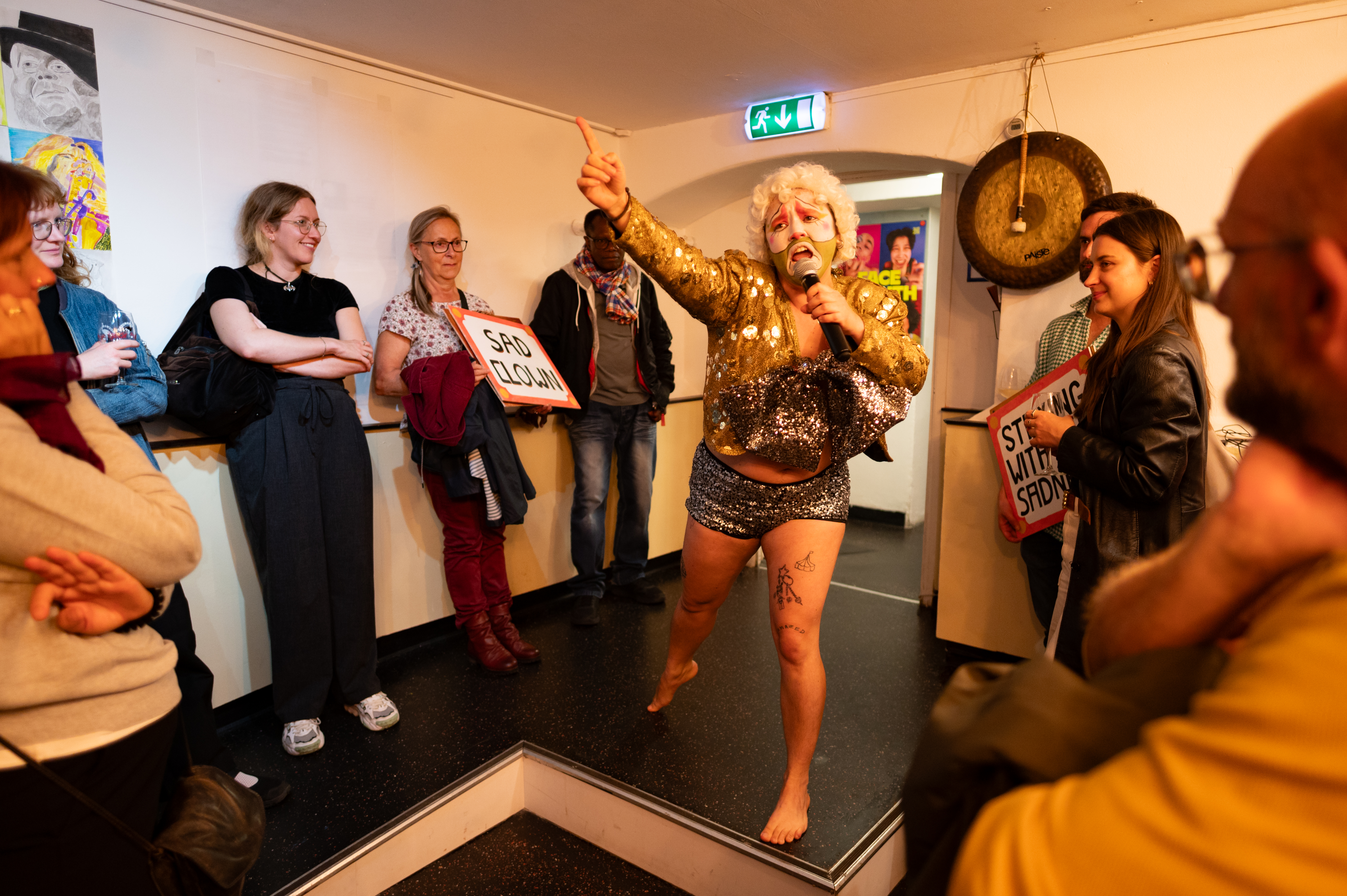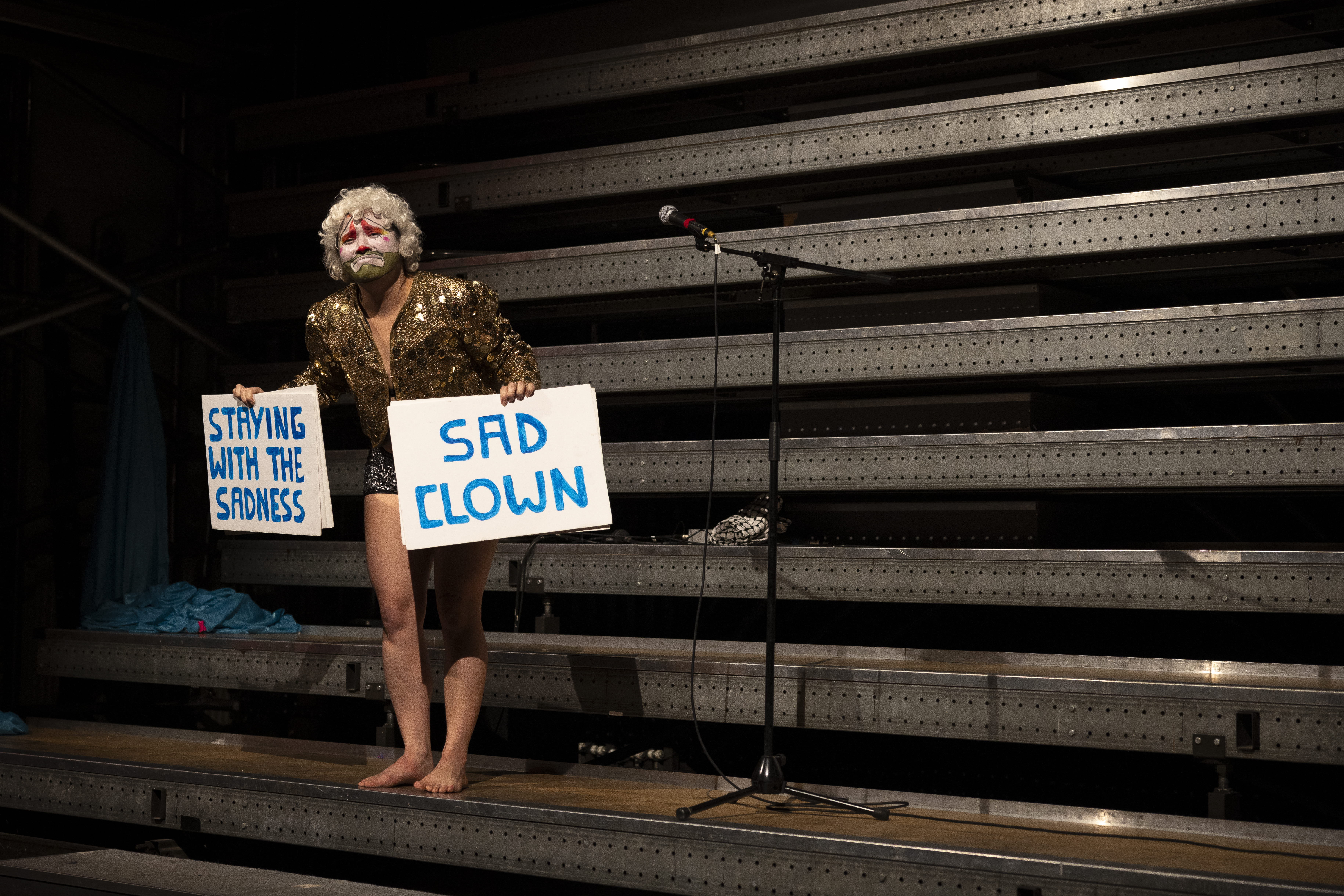 The performance unfolds as a dynamic interplay between structured spectacle and raw emotional exchange. Lip-syncing, an act both deeply performative and intensely personal, becomes a conduit for channeling grief, joy, and longing. These moments are juxtaposed with somatic practices that invite the audience into the clown’s world, breaking the fourth wall in cathartic communion. Together, audience and performer scream their sadness away, releasing a collective weight that words alone cannot carry.